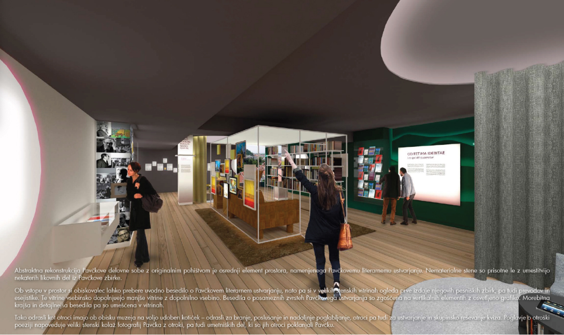Najpomembnejša razstavna vsebina – Pavčkova poezija – je predstavljena na vizualno izstopajoči dinamični projekciji na krogih.
